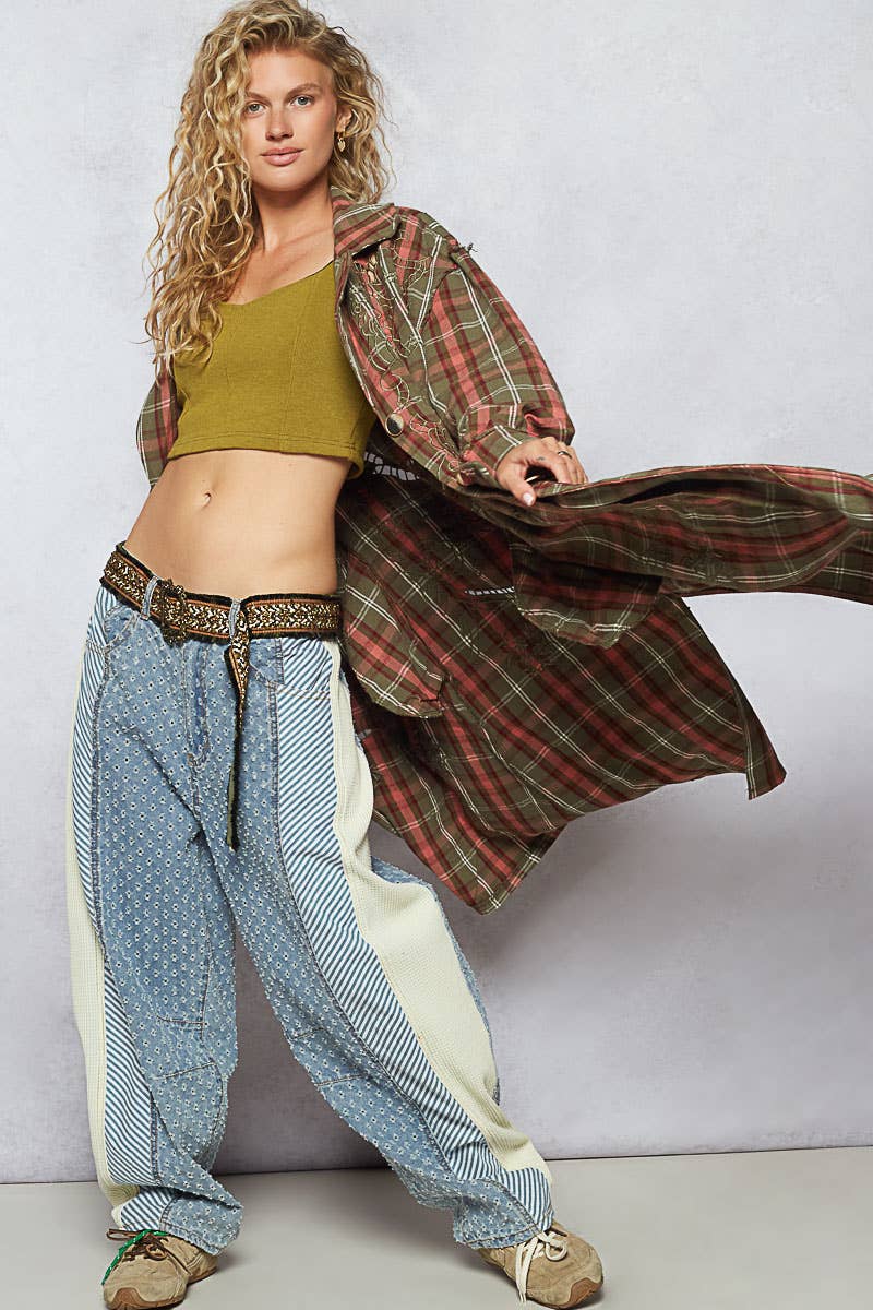 Pol Clothing - Lapel collar contrast stitch details plaid long jacket